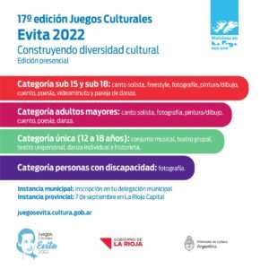 Por última invitan a participar de la 17º edición Juegos Culturales Evita 2022 – “Construyendo diversidad cultural” – Edición presencial