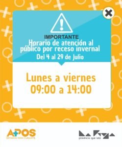 A raíz del receso invernal para las y los agentes de la administración pública, la obra social provincial informó que a partir del lunes 4 y hasta el viernes 29 de julio el horario de atención al público será en un solo turno de 9.00 a 14.00.