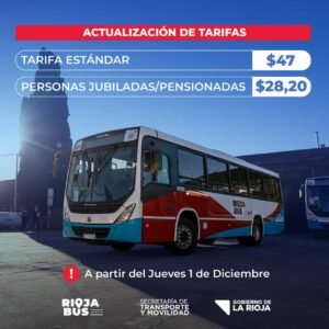Desde la Secretaría de Transporte de la provincia, informaron que a partir de este jueves 1 de diciembre el boleto de Rioja Bus tendrá un costo de 47 pesos. Mientras que jubilados, jubiladas, pensionados y pensionadas deberán pagar 28,20 pesos.