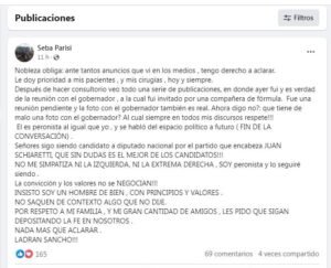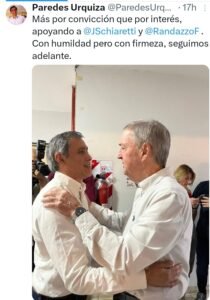 Los candidatos a senadora Andrea Mercado Luna y a diputado nacional Sebastián Parisi, por el partido “Hacemos por Nuestro País”, se reunieron con el gobernador Quintela. Trascendió que ambos su apoyo a la postulación presidencial de Sergio Massa, aunque manifestaron que continuarán siendo candidatos del «Schiarettismo .»