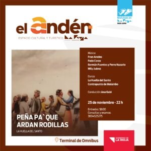 “Peña pa’ que ardan las rodillas”, con artistas invitados: Fran Aredes, Fede Corzo, Germán Fuentes, Perro Nazario, Mily Juárez. En danza: La huella del santo y Contrapunto de malambo.