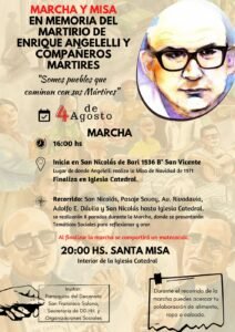 El jueves 4 de agosto se conmemora un nuevo aniversario del asesinato del hoy beato, Enrique Angelelli. Desde la diócesis de la provincia, las parroquias del Decanato San Francisco Solano, la Secretaría de Derechos Humanos y organizaciones sociales coordinan una marcha y misa para mantener viva su memoria, bajo el lema “Somos pueblos que caminan con sus mártires”.
