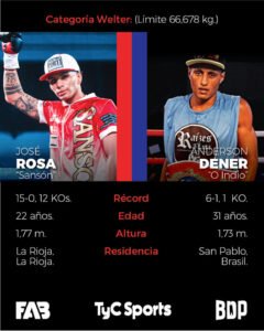 José “Sansón” Rosa, cuenta con 15 victorias, 12 de ellas por nocaut y ninguna derrota. En el pesaje oficial del pasado jueves, la balanza marcó 66.600 kilos para el riojano. Mientras que su adversario, el brasileño Anderson Dener de 31 años cuenta con seis victorias, cinco de ellas por nocaut y una derrota. Dener llegó al pesaje de 66.000 kilos.