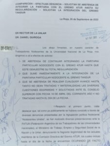 En este contexto, los trabajadores nodocentes denunciantes elevaron una nota al rector de la UNLaR, Daniel Quiroga, en la que le pidieron que se abstenga de seguir integrando la mesa paritaria con el gremio ATUR «hasta tanto se demuestre su total regularización».