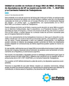 A la salida del encuentro, Martínez dialogó con C5N a cerca del encuentro: «Respeto tanto a los dirigentes del movimiento obrero, sean de la central que sean, que tienen que ser ellos los que anuncien el plan de acción. Hoy, charlando con la CGT y la CT, quedamos en que vamos a trabajar para rechazar el DNU» y adelantó que la estrategia parlamentaria del espacio «va a contar con el acompañamiento de las centrales obreras y la decisiones que tomen ellos respecto a su planes de lucha van a contar con el acompañamiento de los bloques parlamentarios».