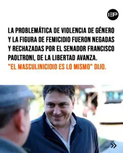 Francisco Paoltroni, que llegó al Senado el 10 de diciembre pasado de la mano de La Libertad Avanza, negó la violencia de género y hasta se animó con absoluto desconocimiento de la problemática a rechazar la figura de femicidio: «el masculinicidio es lo mismo» dijo el senador y afirmó: «No hago diferencia entre un hombre y una mujer, para mí es un homicidio», dijo en declaraciones radiales hace unas semanas. “Masculinicidio y femicidio son horrorosos los dos, son homicidios y deberían estar penados igual, esa figura penal hay que modificarla”, expresó.