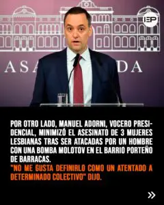 El lunes pasado, el vocero presidencial, Manuel Adorni fue consultado sobre el lesbicidio de 3 mujeres en Barracas y su respuesta fue lamentable: «No me gusta definirlo como un atentado a determinado colectivo». es injusto hablar solo de este episodio cuando la violencia es más abarcativa» y agregó: «Está mal, sea a quien sea».
