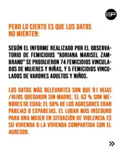 Los datos más relevantes son que 91 hijas /hijos quedaron sin madre, el 63 % son menores de edad; el 58% de los agresores eran parejas o exparejas. El lugar más inseguro para una mujer en situación de violencia es su vivienda o la vivienda compartida con el agresor (60% fueron asesinadas en su hogar). Y si bien los femicidios abarcan el territorio nacional, en términos absolutos Buenos Aires sigue siendo la provincia con más casos, seguida por Santa Fe, Misiones y Salta.