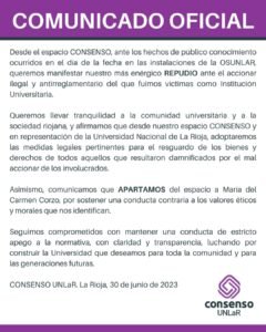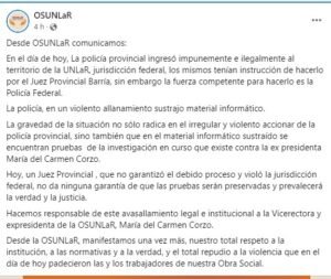 Posteriormente, desde OSUNLaR emitieron un comunicado apuntando contra el magistrado actuante y la ex presidenta de la institución y actual vicerrectora de la Casa de Estudios.