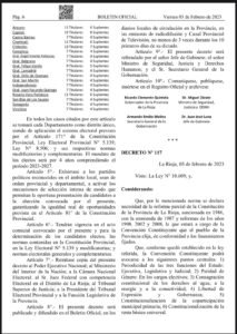 Además de la fecha establecida, el decreto expresa que además de Gobernador y Vice, la población habilitada a votar deberá elegir diputados provinciales en los siguientes Departamentos: Arauco, Chamical, Chilecito, Gral. Belgrano, Famatina, Gral. Lamadrid, Gral. Ortiz de Ocampo, Gral. San Martín, Independencia, San Blas de los Sauces y Ángel Vicente Peñaloza.