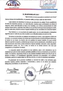 En el cierre, los docentes nucleados en SELaR advierten que “el gobernador manifiesta su voluntad de recibir a los sindicatos para escuchar nuestros pedidos (salariales y estructurales) y vemos en tal actitud una vocación dialoguista y conciliadora, la cual valoramos”.