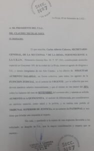 Al pedido lo formalizó la Unión de Empleados Judiciales de la Nación (UEJN) – Seccional La Rioja mediante una nota dirigida al presidente del Tribunal Superior de Justicia (TSJ), Claudio Saúl.