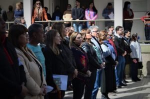 La conmemoración tuvo lugar en la explanada del palacio municipal, fue encabezada por la Intendenta Brizuela y Doria y participaron funcionarios y funcionarias del gabinete municipal y trabajadoras y trabajadores.