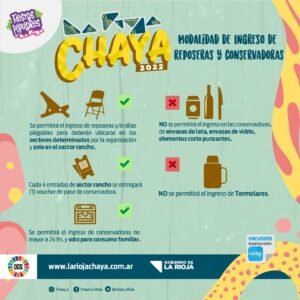 Desde el Gobierno de la Provincia se aclaró que podrán llevar reposeras y conservadoras al sector de Ranchos, únicamente aquellas personas que hayan adquirido de manera simultánea, cuatro entradas (no abono) y hayan recibido el voucher correspondiente que otorga el Banco Rioja al momento de emitir los tickets de acceso a La Rioja Chaya 2022.