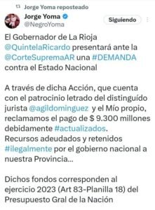 Yoma confirmó la demanda a través de la red social X al advertir que “a través de dicha Acción, reclamamos el pago de $ 9.300 millones debidamente actualizados. Recursos adeudados y retenidos ilegalmente por el gobierno nacional a nuestra Provincia”.