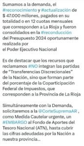 El también dirigente político sostuvo que “dichos fondos corresponden al ejercicio 2023 (Art 83-Planilla 18) del Presupuesto General de la Nación” y “sumamos a la demanda, el reconocimiento y actualización de $ 47.000 millones, pagados en su totalidad o en 12 cuotas mensuales que corresponden a La Rioja y fueron consolidados en la reconducción del Presupuesto 2024 oportunamente realizada por el Poder Ejecutivo Nacional”.