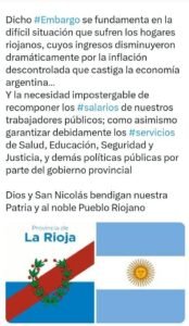 “Dicho embargo se fundamenta en la difícil situación que sufren los hogares riojanos, cuyos ingresos disminuyeron dramáticamente por la inflación descontrolada que castiga la economía argentina. Y la necesidad impostergable de recomponer los salarios de nuestros trabajadores públicos; como asimismo garantizar debidamente los #servicios de Salud, Educación, Seguridad y Justicia, y demás políticas públicas por parte del gobierno provincial”.