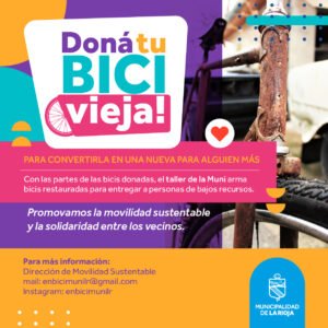 La Municipalidad de La Rioja, a través de la Dirección de Movilidad Urbana Sustentable, dependiente de la Subsecretaría de GIRSU, lanzó la campaña “Doná tu Bici Vieja” con la finalidad de conseguir bicicletas que ya no se utilicen, para repararlas y donarlas a quienes las necesiten; de esa manera se busca darle una nueva oportunidad e impulsar el uso de medios de movilidad sustentable en la ciudad.