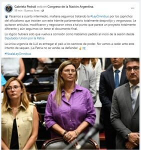 «Le quitaron artículos, modificaron y negociaron otros a tal punto que parece un proyecto totalmente distinto. Lo lógico hubiera sido que vuelva a comisión, como pedimos al inicio de la sesión desde @Diputados_UxP», agregó; para luego postear: «La única urgencia de LLA es entregar el país a los sectores de poder. No vamos a ceder ante este intento de saqueo. ¡La Patria no se vende, se defiende! Y esa Patria estuvo hoy afuera del Congreso, en cada argentino/a q vino a defender sus derechos, nuestra identidad y soberanía».