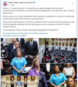 A su tiempo, Hilda «Beba» Aguirre de Soria manifestó: «Pasaron 11 horas de sesión y, coherentes a las desprolijidades que nos tiene acostumbrados el oficialismo nacional, estamos debatiendo sin dictamen; es decir, sobre la nada misma».