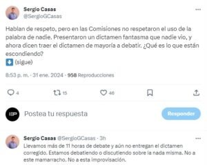 Por otra parte, Sergio Casas escribió en su cuenta «X»: «Hablan de respeto, pero en las Comisiones no respetaron el uso de la palabra de nadie. Presentaron un dictamen fantasma que nadie vio, y ahora dicen traer el dictamen de mayoría a debatir. ¿Qué es lo que están escondiendo?»