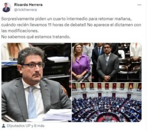 Por último, de manera más escueta, Ricardo Herrera reprochó: «Sorpresivamente piden un cuarto intermedio para retomar mañana, cuándo recién llevamos 11 horas de debate!! No aparece el dictamen con las modificaciones. No sabemos qué estamos tratando».