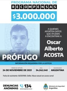El Ministerio de Seguridad de la Nación comunicó el ofrecimiento de una recompensa de tres millones de pesos ($3.000.000) para quien aporte datos que permitan lograr la aprehensión de Oscar Alberto Acosta, imputado de abuso sexual con acceso carnal. El sujeto es buscado desde noviembre de 2021, cuando fue denunciado en la justicia de Chilecito.