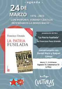 La Asociación de Ex Presas y Presos Políticos de La Rioja invita a la presentación de la reedición del libro «La patria fusilada», del periodista y escritor Francisco «Paco» Urondo. En esta oportunidad, se conversará con el editor del Fondo de Cultura Económica Daniel Riera y Raquel Camps, hija de uno de los protagonistas de la obra Alberto Camps. La Convocatoria es para el próximo 17 de marzo, desde las 19.30, en Espacio 73.