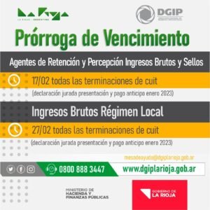El Ministerio de Hacienda y Finanzas Públicas, a través de la Dirección General de Ingresos Provinciales (DGIP), informa que se decidió prorrogar los vencimientos de la declaraciones juradas y pagos del anticipo del mes de Enero/2023 tanto de Agentes de Retención y Percepción del Impuesto sobre los Ingresos Brutos y a los Sellos, como así también del Impuesto sobre los Ingresos Brutos Régimen Local.